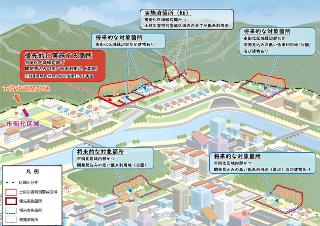 - 市街化区域内の土砂災害特別警戒区域について、段階的に逆線引きを進めていきます。